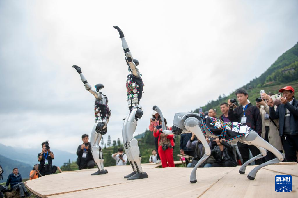 2025年4月26日,机器人在贵州省从江县加榜梯田上参加梯田走秀活动。