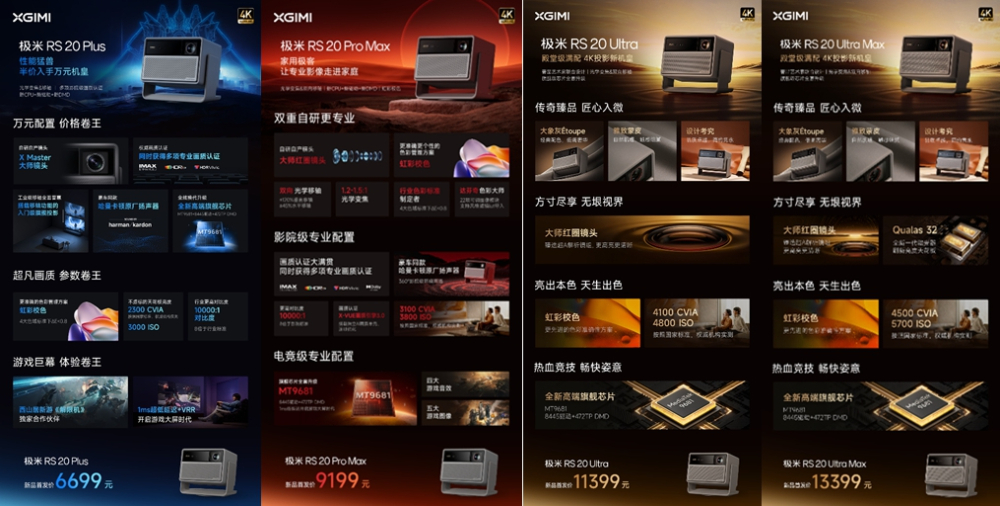 在价格方面,极米RS 20 Plus/RS 20 Plus《解限机》联名限定套盒,零售价为6699元;RS 20 Pro Max,零售价为9199元;RS 20 Ultra,零售价为11399元;RS 20 Ultra Max,零售价为13399元。
