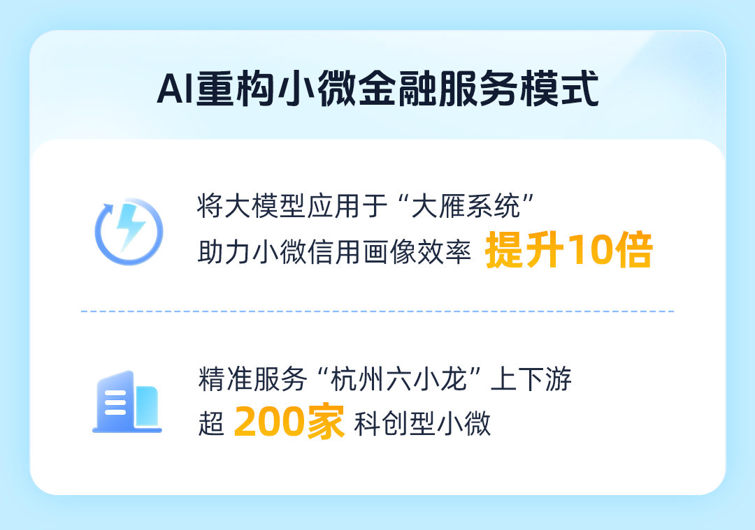 在产业链金融领域,网商银行将AI大模型应用于“大雁”系统,通过深挖产业链关系、提升行业认知,帮助不同行业、不同产业链环节的优质小微获得资金支持,小微信用画像效率提升了10倍。