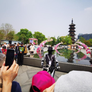 4月10日,一台人形机器人在上海龙华广场表演吉他弹唱,吸引市民游客驻足拍照。新华社记者 陈爱平 摄