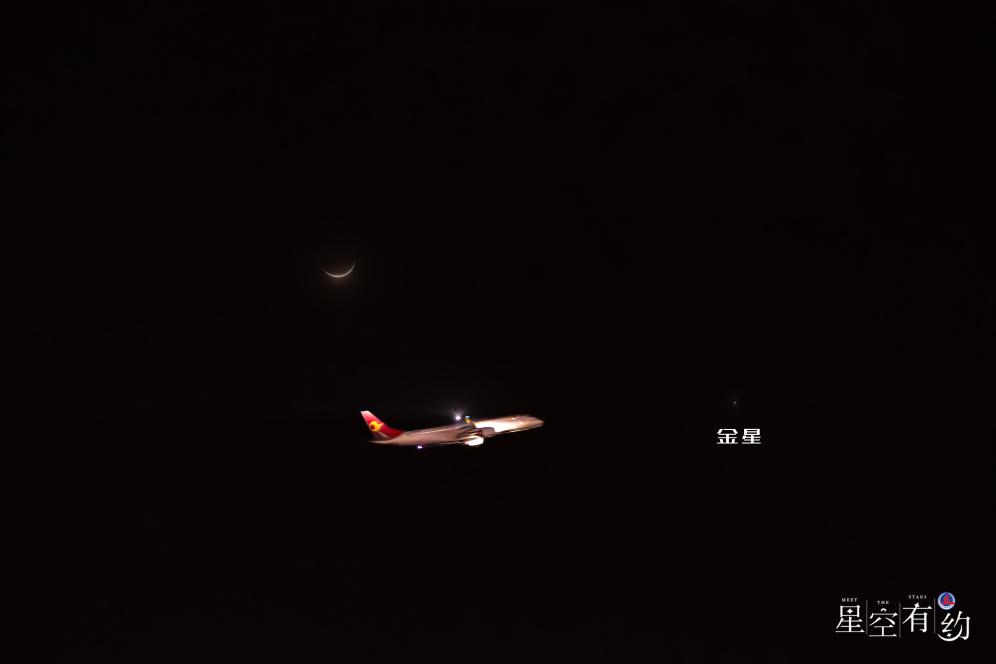 2025年3月2日,一架客机从天津滨海国际机场起飞,恰好从月亮和金星之间穿过。(钟奕 摄)