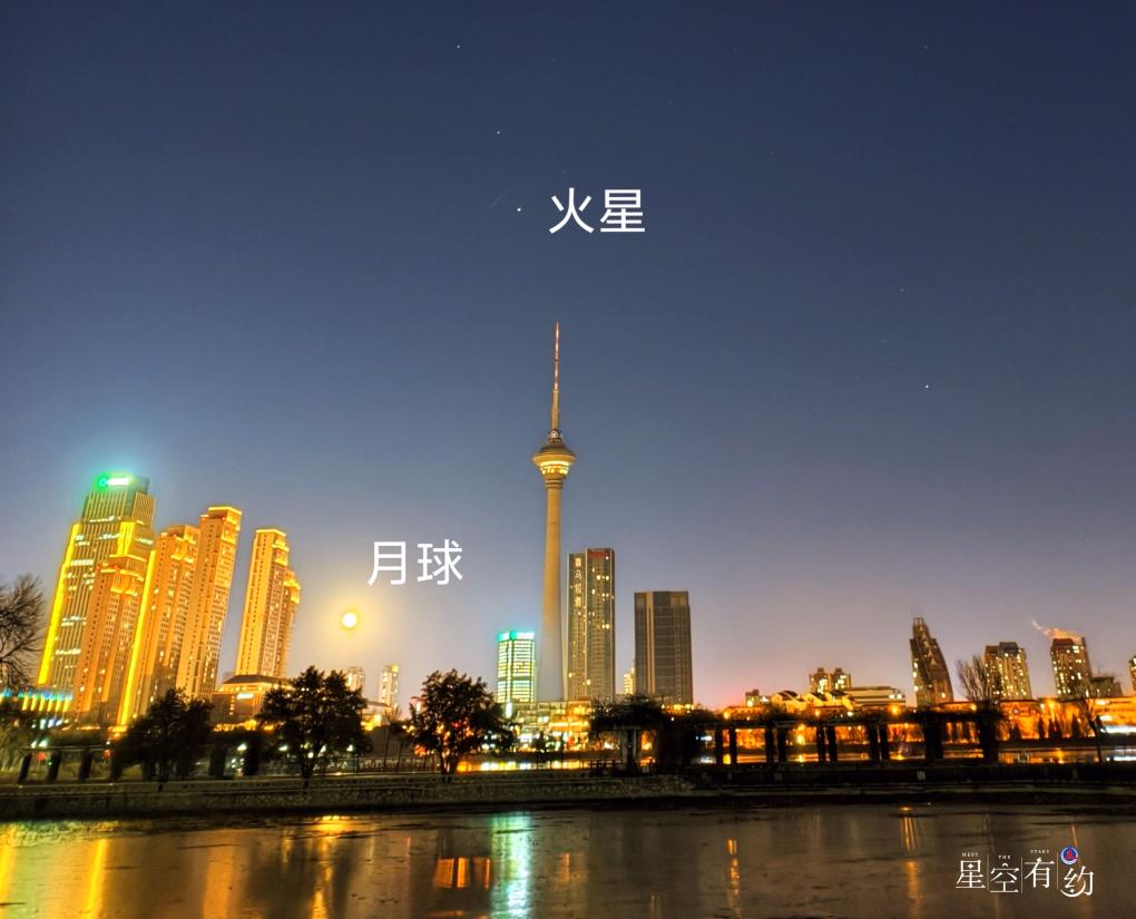 2025年1月15日在天津南开区水上公园拍摄的火星伴月。(钟奕 摄)