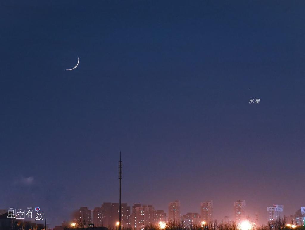 2022年1月7日水星东大距。这是东大距前夕的1月4日傍晚在天津东丽区拍摄到的水星伴月。(杨婧 摄)
