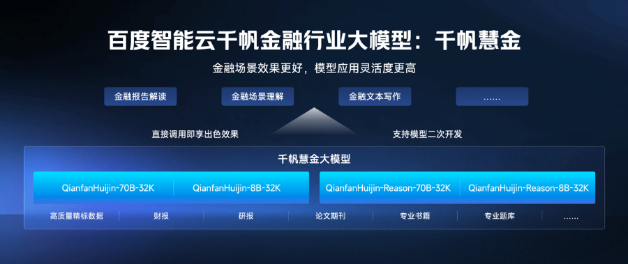 当前,人工智能技术正处于从基础突破走向产业融合的关键阶段。在这一思路指导下,百度智能云以金融行业为突破口,推出千帆慧金金融大模型。该模型在充分吸收海量金融语料基础上,通过构建金融专用数据生成体系,优化推理与知识增强算法,形成了兼具知识广度与逻辑深度的模型能力。当前,百度智能云已推出千帆慧金金融知识增强大模型和千帆慧金金融推理增强大模型,提供8B和70B两个版本,支持最长32K上下文输入,覆盖金融行业多数场景。