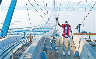 “由于猫道为镂空的柔性非铺装路面,加之高空强风带来的晃动,对机器人的运动控制、视觉感知、自平衡能力和避障都提出了更高要求。”机器人研制方、飞阔科技联合创始人刘炳政介绍。完成此次挑战,在一定程度上加速着中国智造与中国建造的“双向奔赴”。