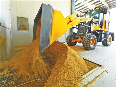 装载机将小麦铲入烘干机进料口。