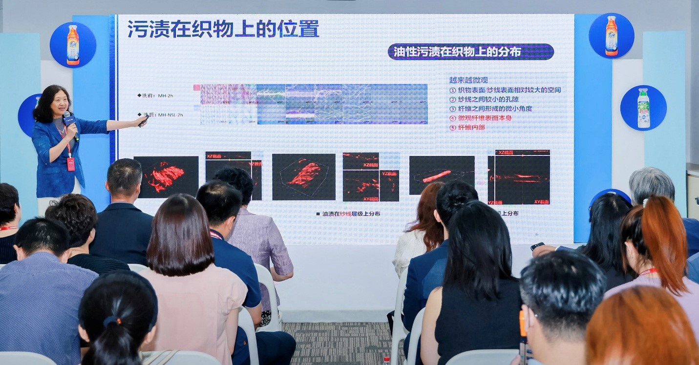 研究院的科研方向直指行业核心技术突破点。东华大学服装与艺术设计学院教授丁雪梅在其专题报告《中国消费者衣物污渍清洗》中,深入剖析了中国消费者衣物材质多样化与污渍复杂性带来的清洁难题,并表示团队首次和宝洁利用低频核磁共振仪器,在微观层面已实现观测单根纤维与污渍结合的形态结构、纤维横切面和纤维凹槽的藏污程度,以及老化油渍藏匿于棉纤维的中空结构的现象,并成功在微观维度验证了洗衣原液对比国标液在针对老化油渍上的优越清洁效果。浙江大学微生物学教授Stijn van der Veen则在其报告《菌渍及生物膜形成对衣物清洗带来的挑战》中,揭示了困扰消费者的衣物“发黄”、“异味”问题的微生物学根源——菌渍,并表示菌渍中生物膜一旦形成就很难被清洗,有效预防的方式除了每次充分洗涤、减少污渍残留,梅雨季节增加清洗频率与洗涤剂用量之外,还可选择含有特殊表活+复合酶+高分子系统的洗涤剂针对菌渍的主要底物皮脂汗渍进行有效洗涤。这些深度研究为产品的突破性创新奠定了坚实基础。