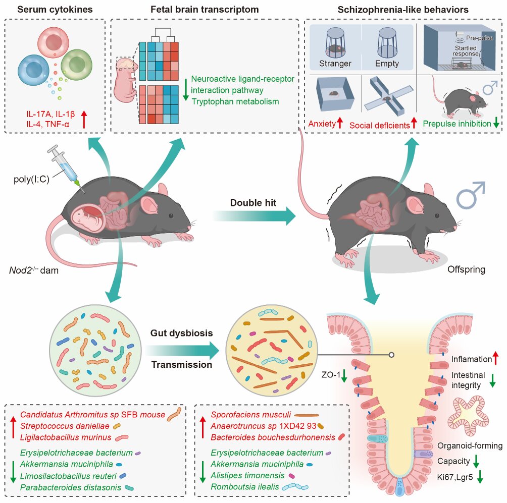 此次研究发现,Nod2基因缺陷与孕期免疫激活的双重暴露可导致雄性子代出现精神分裂症样行为,并伴随脑发育异常、肠道屏障损伤及微生物群紊乱。宏基因组分析进一步证实,母体肠道菌群失调可通过垂直传播影响子代,从而增加子代神经发育障碍风险。机制研究表明,这一过程涉及肠道完整性破坏、肠道类器官形成能力受损、神经递质信号异常以及胎儿脑内基因表达谱的显著改变。