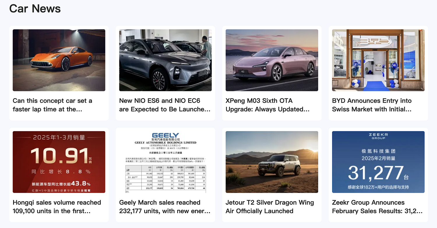 平台集成媲美国内顶级网站的完整车型数据库,尤其精耕当地市场热销的中国品牌车型。目前网站已覆盖660+个品牌,包含2900+个车系、6800+个车款,覆盖3300+经销商。通过80000+张海外售卖车型实拍图,2800+视频,126800+条资讯多维度展示呈现每一款产品,从凌厉的车身线条到细腻的流线工艺,细节之美尽收眼底,彷佛亲临车展。