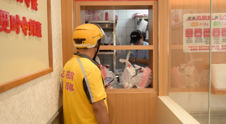 骑手在南城香外卖窗口,拿取拼好饭与品牌定制的套餐