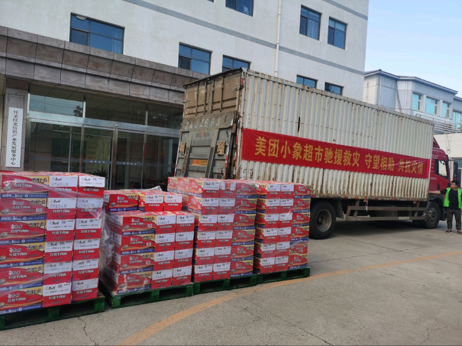 洪涝灾害发生时,受灾群众被紧急转往安全地带后,生活物资较为紧缺,特别是食品、饮品等。美团小象超市紧急调拨超25000件物资,包括自热锅、矿泉水、方便面、火腿肠等食品,于7月29日发车从顺义仓库送往密云、怀柔等受灾地区,目前部分物资已送达怀柔北房镇,用于当地居民过渡阶段的生活保障。