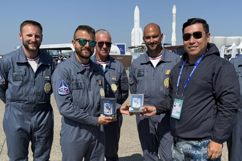 在55届巴黎航展上,中国观众用卡游“歼-20典藏卡”与法兰西巡逻兵飞行员们交换礼物。 受访者供图