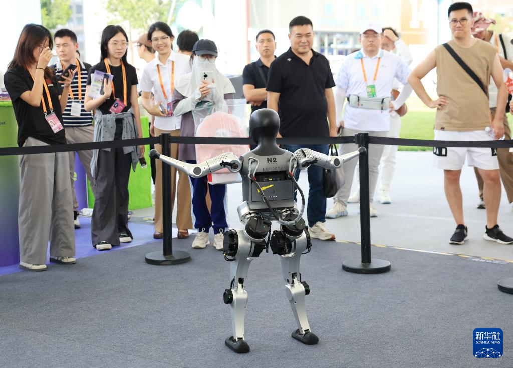 9月11日,参观者在体育服务专题展区观看人形机器人做广播体操。
