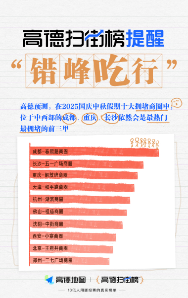 十一期间,哪个商圈人最多?高德预测,2025年十大拥堵商圈分别是成都春熙路商圈、长沙五一广场商圈、重庆解放碑商圈、天津和平路商圈、杭州湖滨商圈、佛山祖庙商圈、沈阳中街商圈、西安小寨商圈、北京王府井商圈、郑州二七广场商圈。