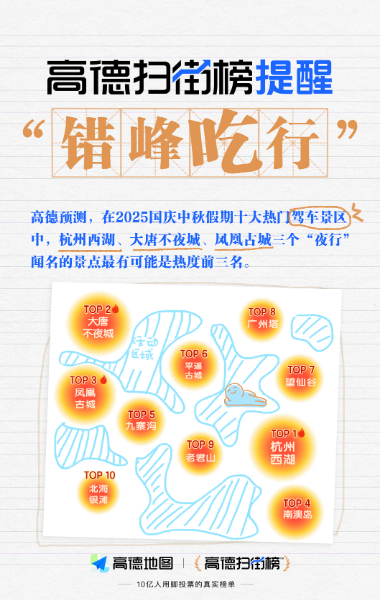 从高德导航数据看,去年十一期间,前往景点的导航数量约是平日的4倍。高德预测,今年国庆,杭州西湖风景名胜区、大唐不夜城、凤凰古城、南澳岛生态旅游区、九寨沟、平遥古城、望仙谷景区、广州塔、老君山风景名胜区、北海银滩国家旅游度假区,将继续成为最热门的驾车旅游打卡目的地。