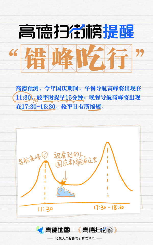 国庆午餐峰值提早15分钟 高德建议“错峰吃行”