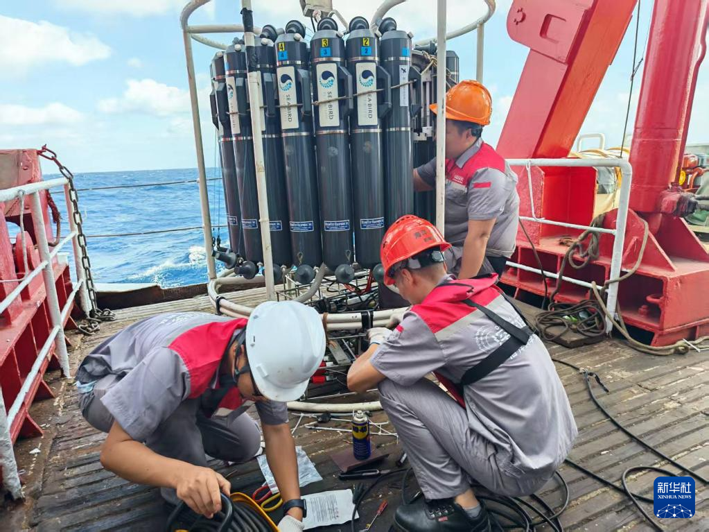 11月1日,工作人员对温盐深剖面仪(CTD取水器)进行调试。新华社记者白瑜摄