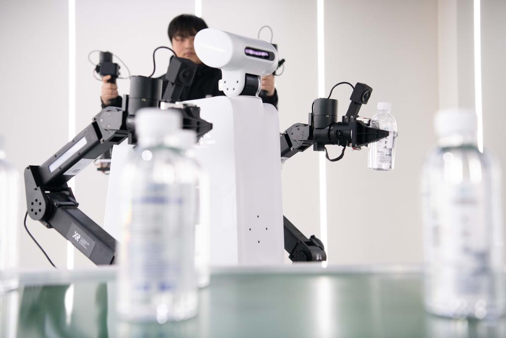 一位机器人训练员头戴VR设备