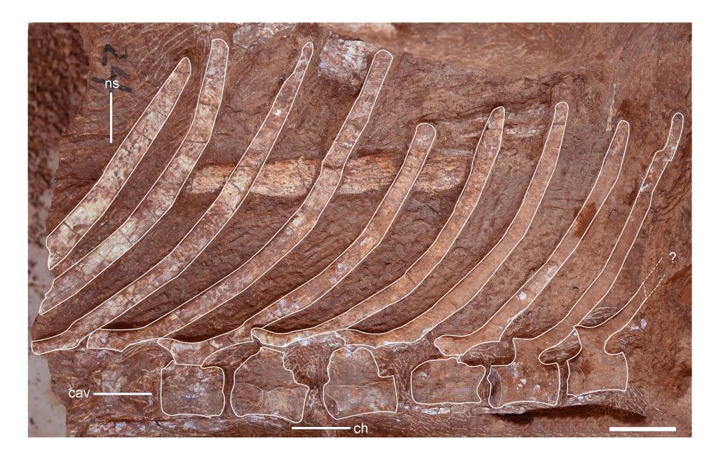 该恐龙最显著的特征是其尾部结构。研究发现,其后部尾椎的神经棘显著增长,高度可达椎体本身的数倍,形成一个独特的“帆状”结构,这在已知的鸭嘴龙类中尚属首次发现。研究人员推测,这一独特的“帆尾”可能用于个体展示、种内识别或体温调节。根据测算,帆尾贡水龙体长约7米,属于中等体型的植食性恐龙,以四肢行走为主。