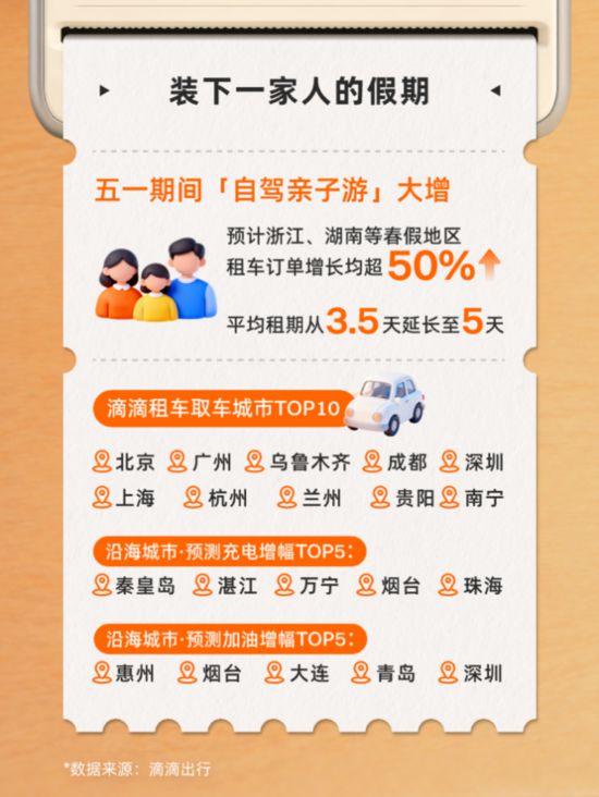浙江、湖南等春假地区亲子游订单增长均超50%,平均租期从3.5天延长至5天。70%的用户提前7天以上预订。针对这一趋势,滴滴租车升级“免费取消”服务——下单前先领取橙意卡,平峰及节假日免费取消期限统一延长至取车前,临时改变计划也能无损退订、灵活调整。