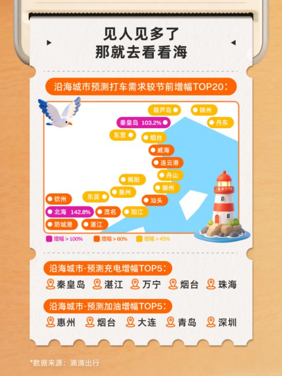 春假、拼假的加入,让很多人进入更松弛的长假节奏,从南到北,沿海城市成为度假热选。预计北海和秦皇岛打车需求较节前分别上涨142%、103%,威海、茂名、防城港、连云港、湛江、汕头、钦州的增幅预计也在六成以上。