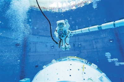 航天员翟志刚身着水下训练服(舱外服之一)进行水下出舱训练中国航天员科研训练中心供图