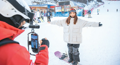 博主在河北崇礼云顶滑雪场录制视频。新华社记者 吴 壮摄