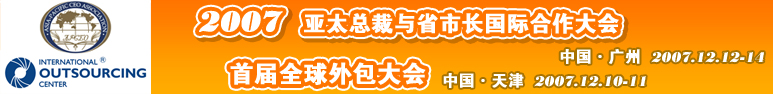 | 第三届亚太总裁与省市长国际合作大会在广州隆重召开 | | 2007年12月13日,由亚太总裁协会、广州市人民政府主办,广州市外经贸局和亚太财富(北京)经济咨询中心承办的"第三届亚太总裁与省市长国际合作大会"在广州白云国际会议中心召开,中共广东省委常委、广州市委书记朱小丹,广州市委副书记、市长张广宁出席了大会。 [详细报道] | | | | 首届全球外包大会在天津成功举办 | | 2007年12月11日,首届全球外包大会在天津经济技术开发区隆重举办。国家商务部、信息产业部、科技部等有关部委领导,澳大利亚前总理鲍勃霍克、雷曼兄弟、IBM、甲骨文、通用电气、加拿大皇家银行、索迪斯集团、电子资讯系统、微软中国、澳新集团、麦肯锡等世界五百强企业、服务外包领军企业,有关国际经济机构代表以及海内外相关发包、接包企业代表共500余人出席大会。 [详细报道] | | |