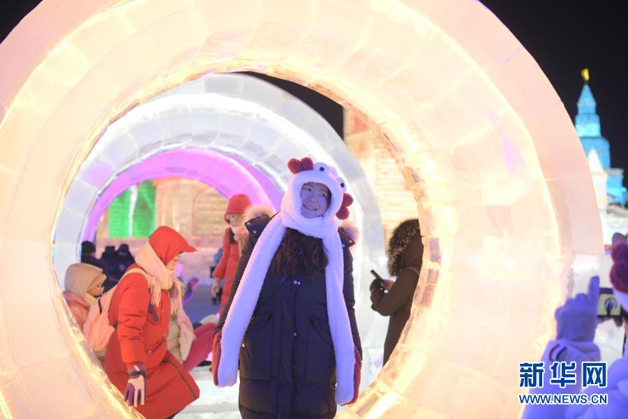 2021年1月2日,游客在哈尔滨冰雪大世界园区游玩。元旦假期,“流光溢彩”的哈尔滨冰雪大世界仿佛冬日里的童话世界,吸引许多市民游客前来观赏游玩。新华社记者 王建威 摄