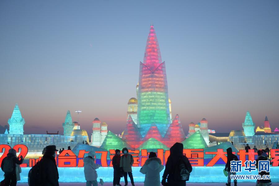 2021年1月2日,游客在哈尔滨冰雪大世界园区游玩。元旦假期,“流光溢彩”的哈尔滨冰雪大世界仿佛冬日里的童话世界,吸引许多市民游客前来观赏游玩。新华社记者 王建威 摄