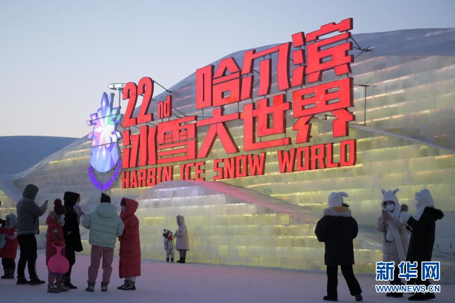 2021年1月2日,游客在哈尔滨冰雪大世界园区冰围墙外侧留影。元旦假期,“流光溢彩”的哈尔滨冰雪大世界仿佛冬日里的童话世界,吸引许多市民游客前来观赏游玩。新华社记者 王建威 摄