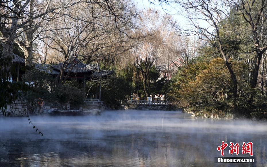 1月7日,受冷空气影响,山东省济南市气温骤降,趵突泉泉水蒸发的水汽上升遇冷形成“云雾”,再现“云雾润蒸”景观。中新社记者 张勇 摄