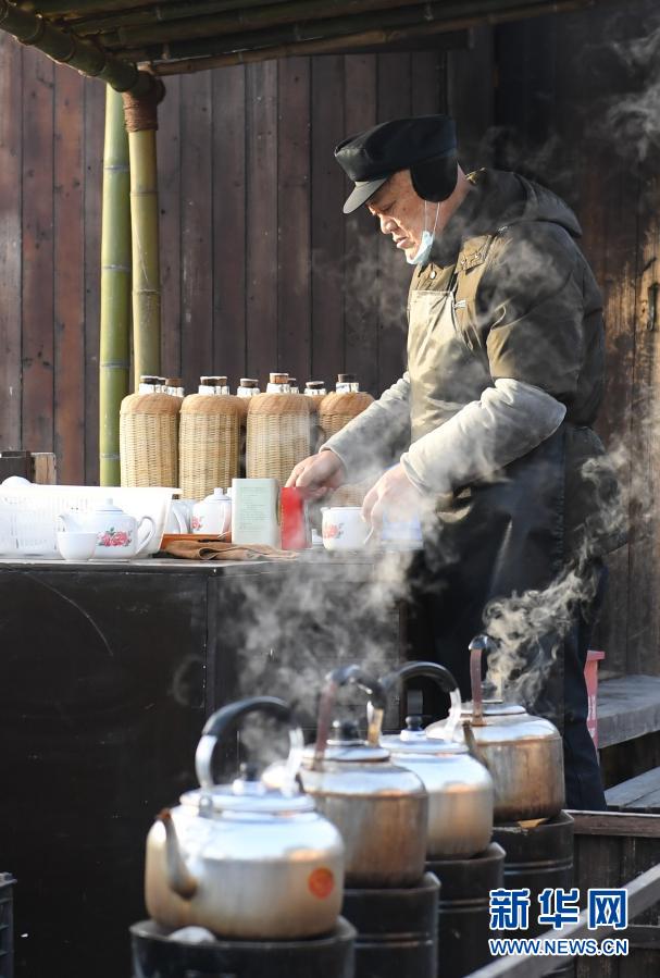 1月12日,一名摊主在乌镇一边煮茶一边给客人制作早餐。