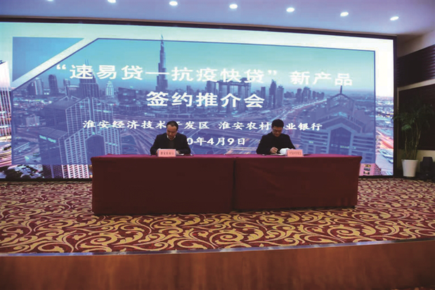 2020年4月,淮安农商银行与淮安市经济技术开发区管委会和开发区金控达成合作事宜,为企业量身定制总金额10亿元“速易贷”系列产品,针对开发区辖内受疫情影响的实体企业,贷款利率优惠低至同期LPR,园区出资1000万元,用于实体企业担保费用的补贴和风险补偿,淮安农商银行对产品贷款免收担保保证金,减费让利,切实将为企业减负落到实处。