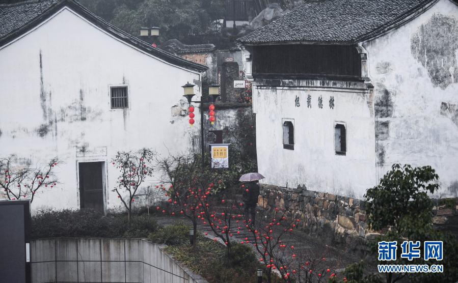 1月22日,游客行走在充满年味的茅塘古村内。