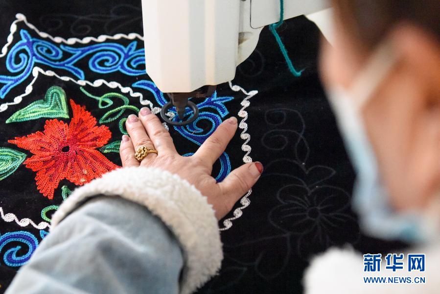 1月23日,在吉木萨尔县白泉村刺绣专业合作社,绣娘在制作哈萨克族刺绣。