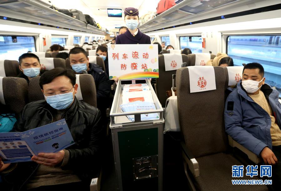 1月26日,乘务员在上海虹桥开往北京南的G124次列车上为旅客提供防疫用品。2021年春运在即,铁路上海客运段落实常态化疫情防控要求,通过在旅途中讲解防疫须知、加大列车公共区域消毒频次、配备列车防疫包和爱心口罩等措施,保障旅客铁路出行安全。新华社记者 陈飞 摄