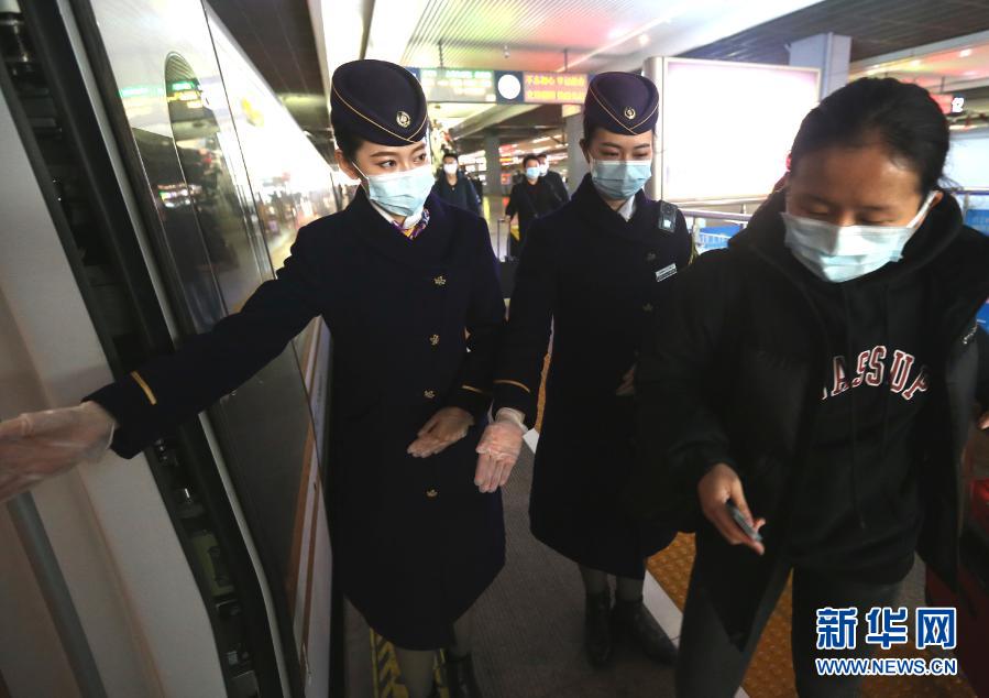 1月26日,G124次列车乘务员在上海虹桥火车站迎接旅客上车。2021年春运在即,铁路上海客运段落实常态化疫情防控要求,通过在旅途中讲解防疫须知、加大列车公共区域消毒频次、配备列车防疫包和爱心口罩等措施,保障旅客铁路出行安全。新华社记者 陈飞 摄