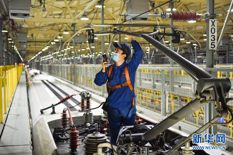 中国铁路沈阳局集团有限公司地勤机械师正在检修动车组设备设施。 陈明摄