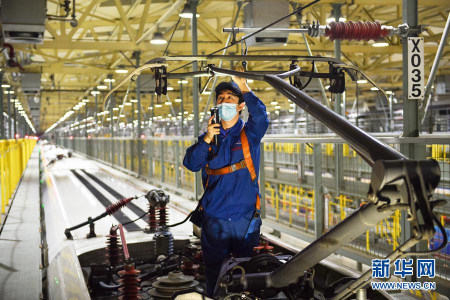 中国铁路沈阳局集团有限公司地勤机械师正在检修动车组设备设施。 陈明摄