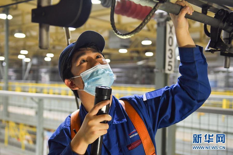 中国铁路沈阳局集团有限公司地勤机械师正在检修动车组设备设施。 陈明摄