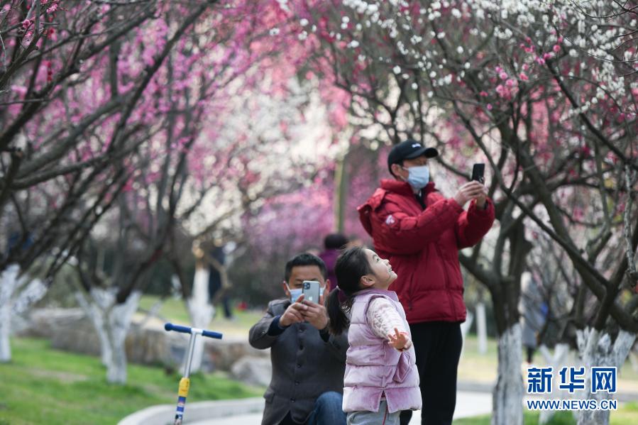 春节期间,安徽省合肥市匡河岸边的梅花竞相绽放,吸引众多市民和游客前来观赏。