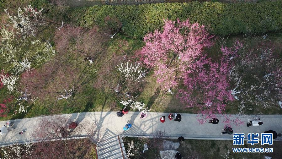 2月17日,游人在合肥市匡河岸边的梅花丛里游玩(无人机照片)。