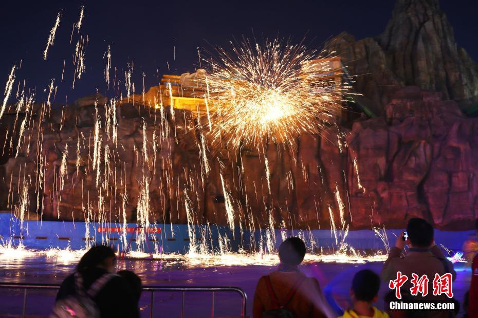2月23日晚,元宵节临近,南昌玛雅乐园上演传统民俗“打铁花”,红红火火迎元宵,吸引游客驻足欣赏、拍照留念。中新社记者 刘占昆 摄