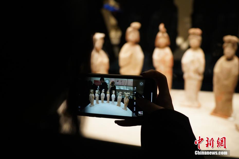2月23日,河南郑州,河南博物院展出的唐俑吸引游客。今年春节河南卫视春晚舞蹈《唐宫夜宴》走红,也给文物带来热度。连日来,前去河南博物院参观的游客络绎不绝,尤其是与《唐宫夜宴》一同出圈的“莲鹤方壶”“簪花仕女图”等尤其吸引游客。中新社记者 阚力 摄