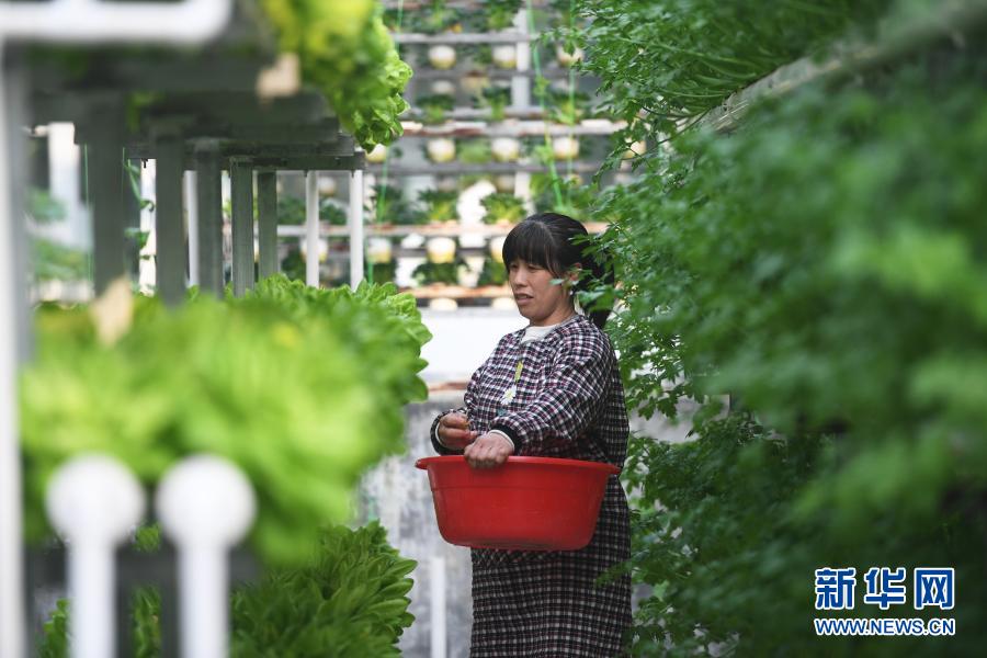 3月9日,在河北省曲周县一家创意农业园区,工人在管理立体无土栽培蔬菜。