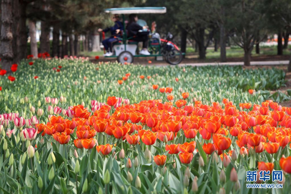 4月8日,游客在石家庄市植物园欣赏郁金香。