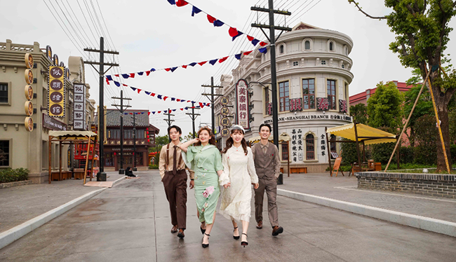 从刷着“十万工农下吉安”红军宣传标语的瑞金街,到设有“东商洋货”和“宝丽唱片行”的“十里洋场”上海街,方特东方欲晓通过大量的仿古建筑、布景,打造了多个还原近现代中国不同时期的社会风貌和人文风情的主题街区、小镇,营造重回历史的氛围。