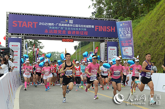 5月16日上午,2021踏秀·广西高峰森林公园马拉松越野赛“奔跑吧广西”生态马拉松系列赛在高峰森林公园南游客中心正式开赛。赛事共吸引了来自全国各地的3600名专业选手和跑步爱好者。