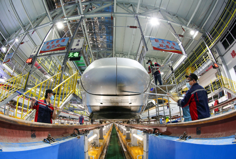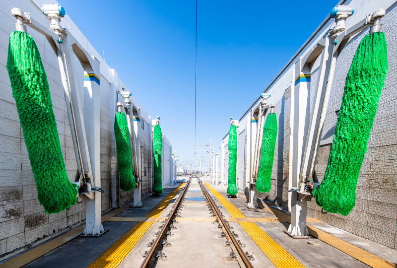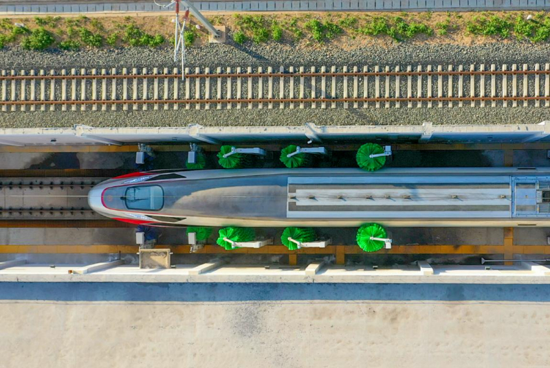 这是北京动车段雄安动车运用所,奔跑在线路上的复兴号动车组每48小时要在这里进行外皮清洗。司机驾驶复兴号按指定线路运行至洗车场外等候,与自动清洗机操作人员联控后,以每小时3至5公里的速度通过设备,经过冲、刷、烘等环节,一列8节车厢的复兴号完成全车外表的自动清洗大概需要5分钟。